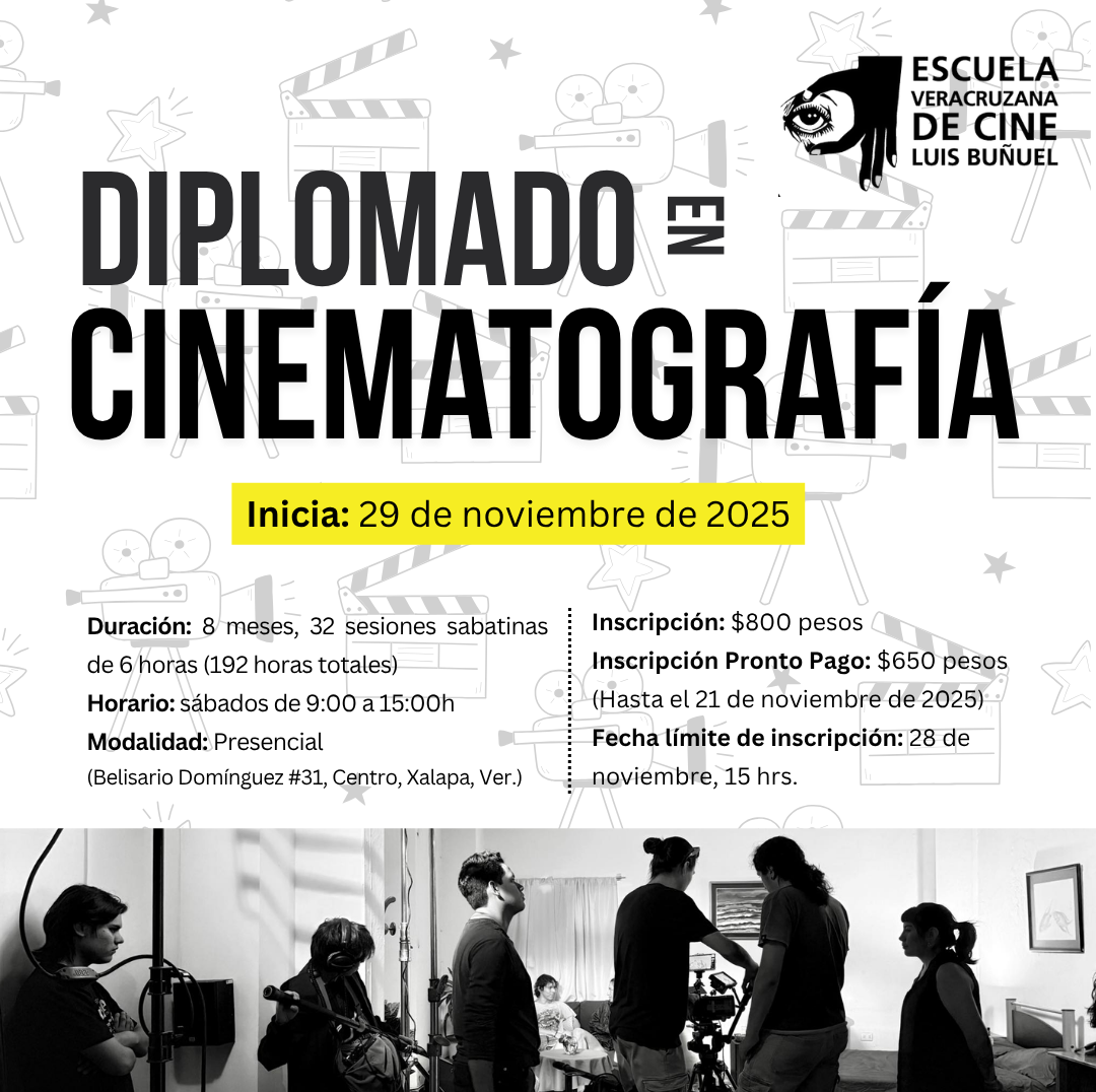 La Escuela Veracruzana de Cine Luis Buñuel se reserva el derecho de cancelación o prórroga de inicio de talleres y diplomados, basándonos en el quórum necesario para iniciar los mismos. En este sentido, no se realizarán reembolsos salvo cancelación del diplomado.